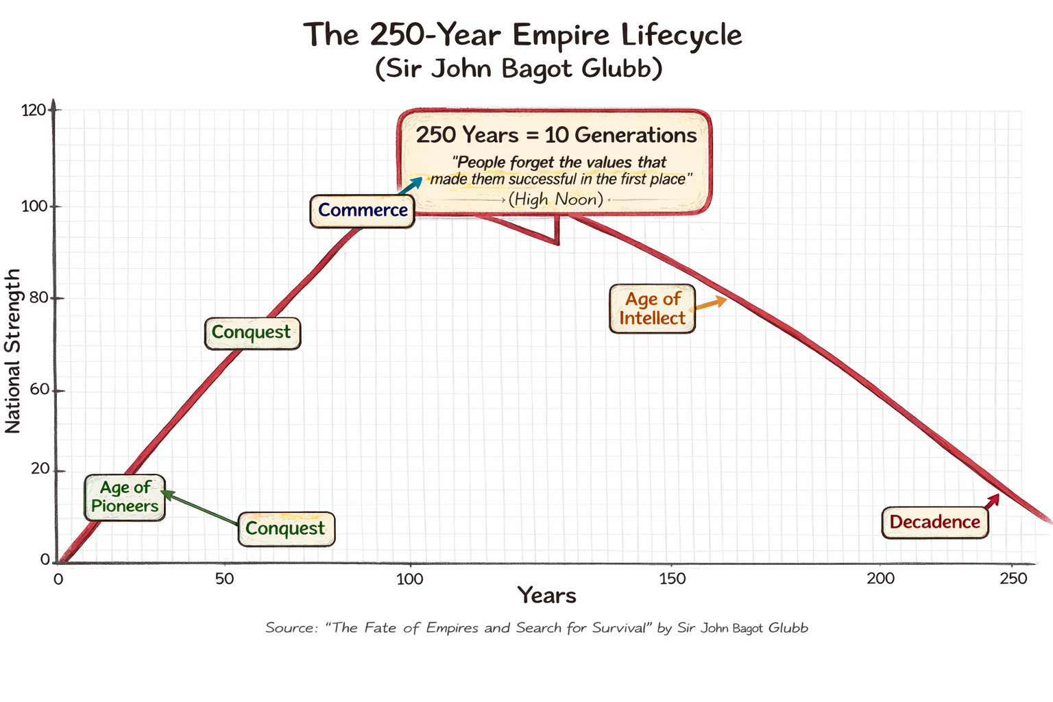 Sir John Bagot Glubb, a British military historian, studied the rise and fall of empires. He found a pattern that held across centuries, continents, and cultures.