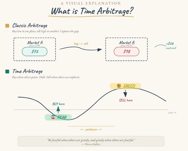 Value investors—the tradition that runs from Benjamin Graham through Warren Buffett—practise a different kind of arbitrage: time arbitrage. They buy when there is temporary madness, hold patiently, and sell when there is temporary exuberance. They recognise that markets are feeble in the short run and rational in the long run. The discipline is to act on a longer time horizon than everyone around you.