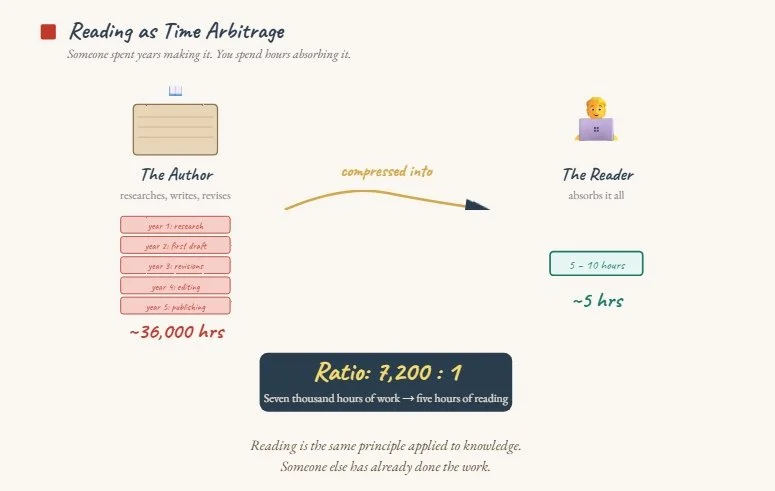 The answer is this: reading books is the most effective time arbitrage available to any human being.